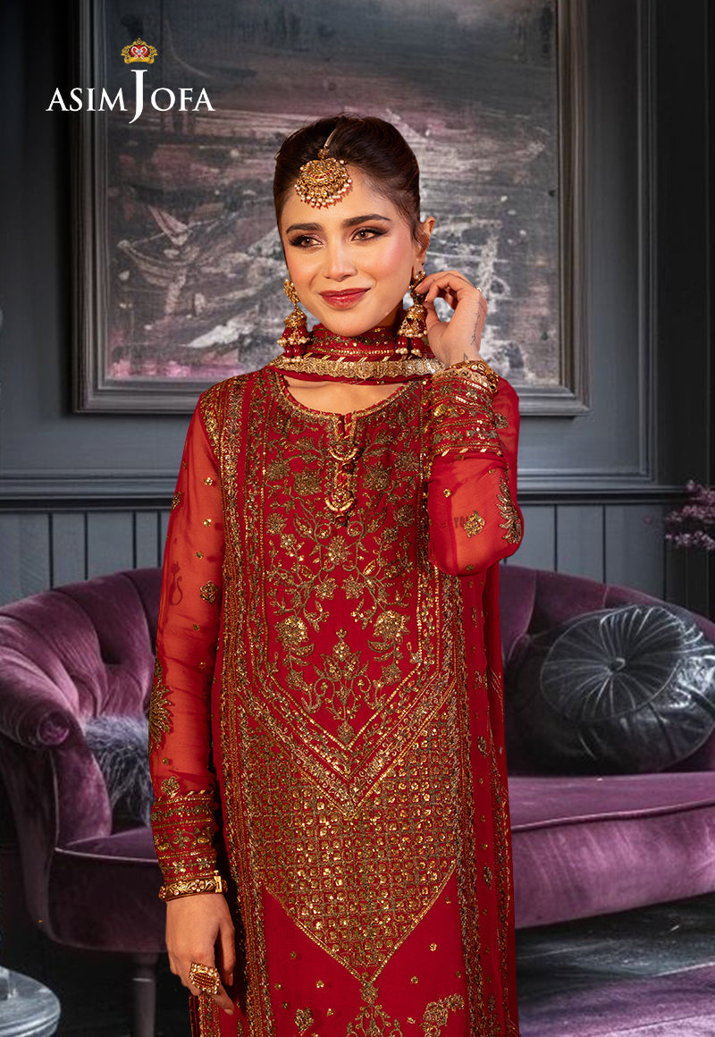 Unravel the splendor of elegance with this exquisite embroidered shirt. A tapestry of red adorned with olive green threadwork and antique gold sequins, it exudes opulence and sophistication. The interplay of two-toned deep gold zariwork adds depth and richness to its allure. With grand borders and a majestic neckline, this ensemble epitomizes regal grandeur. Embrace the allure of royalty and grace every occasion with unmatched magnificence.