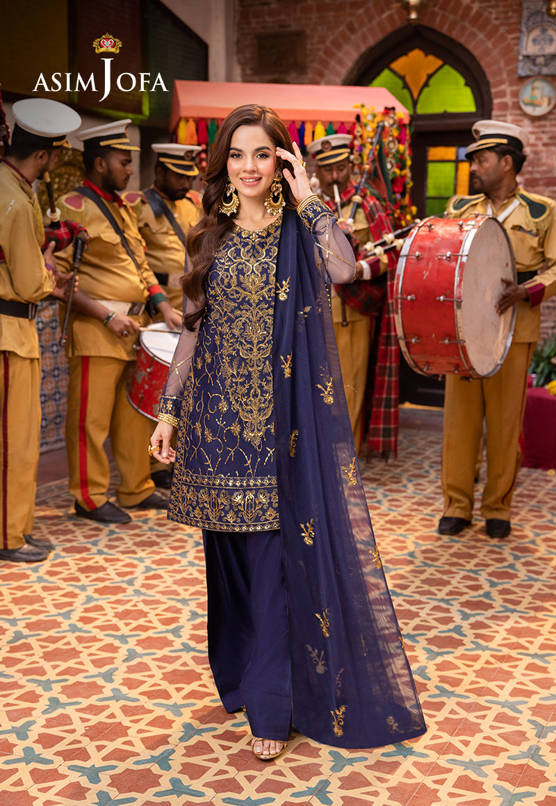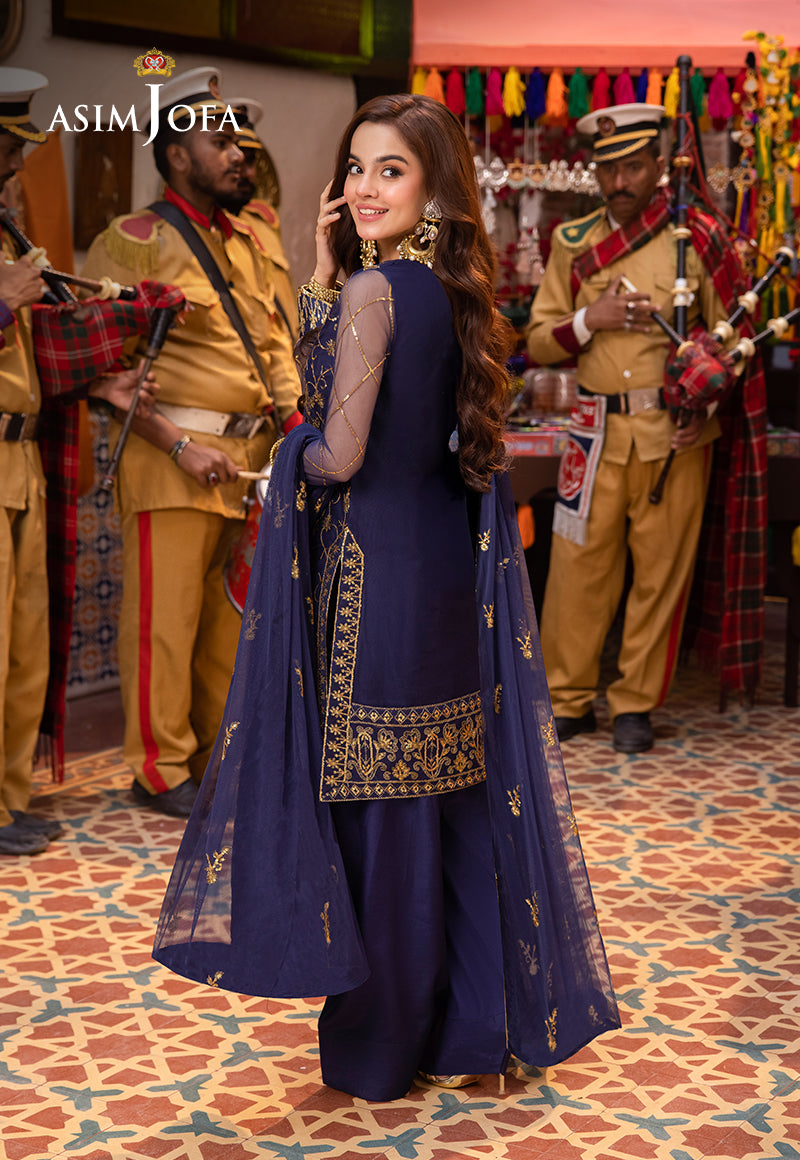 Unleash your inner star with this captivating navy-blue ensemble, a canvas for your confidence. The exquisitely embroidered shirt features a meticulously detailed work all over, adorned with light gold sequins accentuated by the presence of shimmering two-toned gold zari, personifying a gold meteor sparkling in the night sky. Complemented by the luxuriously embroidered dupatta, beautified with a star-dusted embellishment, completing the ensemble with a touch of cosmic glamour. Creating a look that's a mesmerizing ode to the infinite canvas of the night