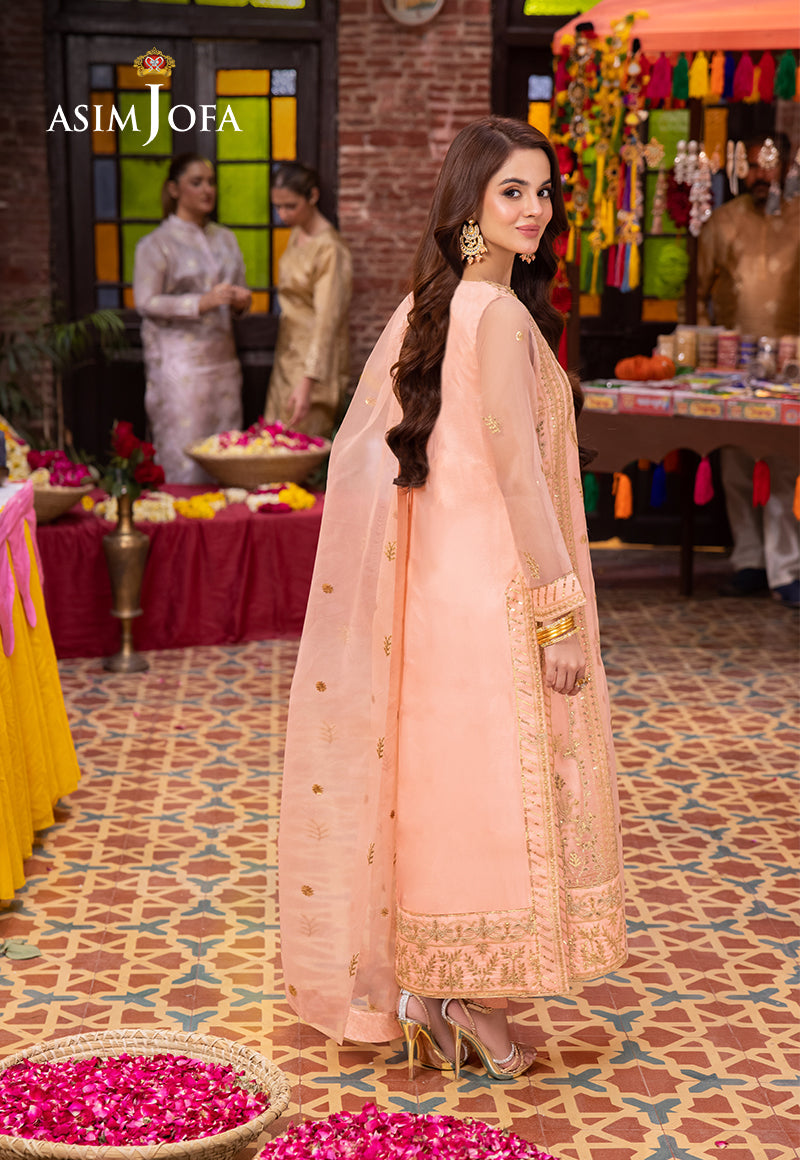Blossom into your most radiant self with this captivating peach ensemble, a canvas for your inner sunshine. The meticulously embroidered shirt unfolds like a blooming flower, each stitch a burst of vibrant color against the soft peach canvas. Scattered like playful sunbeams dancing on a summer day, delicate gold sequins shimmer across the surface with subtle gold zari work adding a touch of understated elegance, like the gentle clinking of gold bangles. The stunning dupatta, embroidered and embellished to complement the shirt, adds a final flourish by completing the ensemble's story of peachy perfection