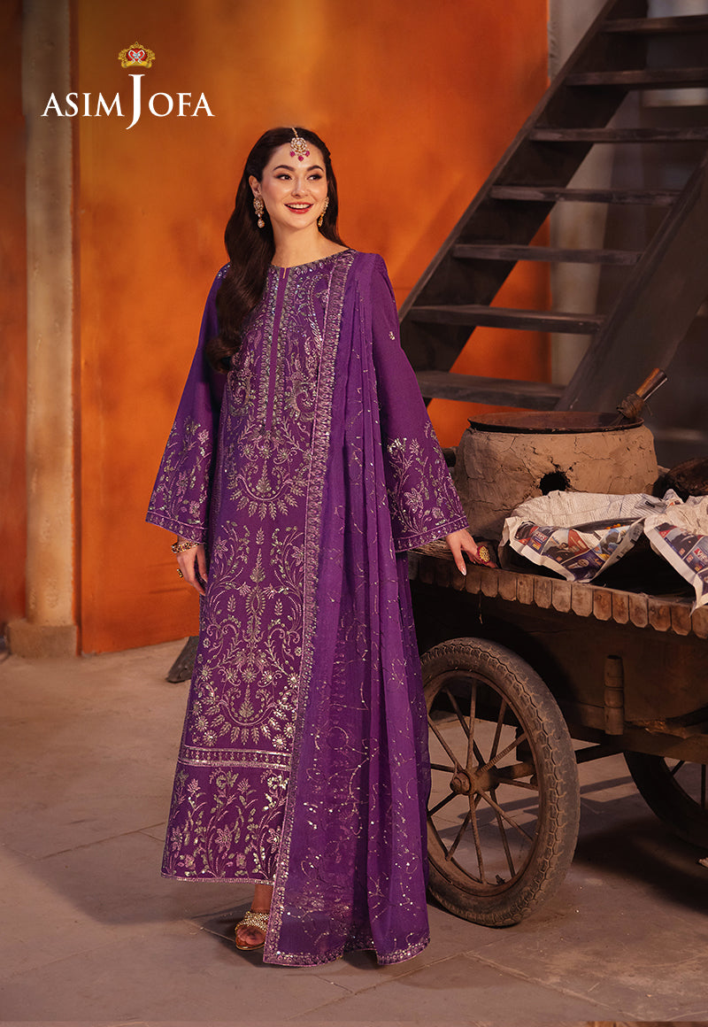 Let this purple outfit, with hints of aster’s glamour, exude an aura of timeless allure. The meticulously embroidered shirt, a masterpiece in itself, features duo-toned mink and pink zari like stardust woven into the fabric. Light gold cupped sequins, sprinkled like dews on fallen aster petals, catch the light and whisper of forgotten wishes. A meticulously embroidered dupatta, a dreamlike cascade of elegance, completes the ensemble, carrying you to the heart of any occasion.