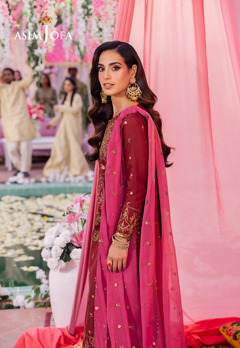 Asim Jofa’s “Jag Mag Collection†unveils this creation that marries the earthy tones of rust with the royal essence of purple. The ensemble’s shirt is a canvas of celebration where the neckline is not just embroidered but crowned with gold sequins and zari complemented by the vibrant strokes of magenta threadwork. The purple embroidered dupatta is the perfect counterpart framing this outfit in a narrative of elegance and festivity. Adorn yourself in this ensemble and embody the spirit of celebration