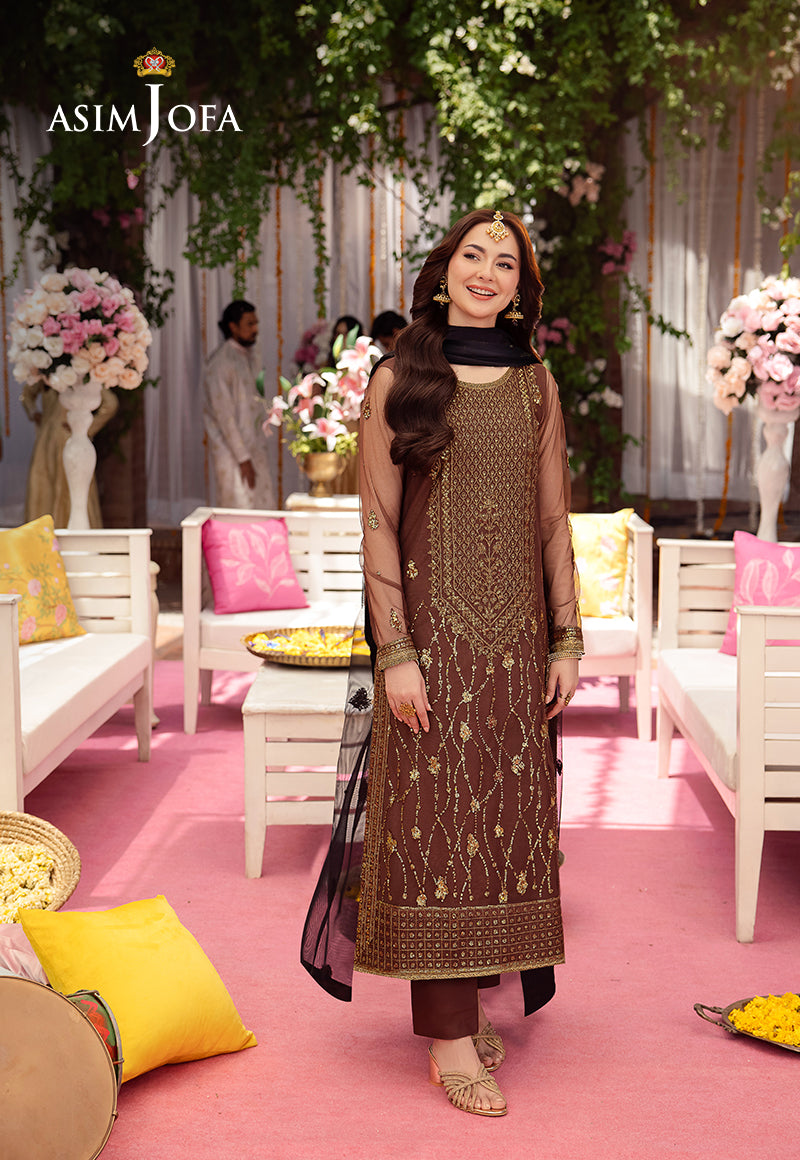 Exude the essence of festive glamour with Asim Jofa’s “Jag Mag Collection.” Presenting our rust ensemble. This ensemble features a long shirt meticulously embroidered with golden sequins and dual-toned zari work that cascade down to the borders. Complemented by maroon threadwork, this piece is nothing short of regal. Paired with it is an ethereal purple dupatta equally adorned with enchanting embroidery adds an extra layer of sophistication to your look. This outfit promises to keep you glowing from day into night.