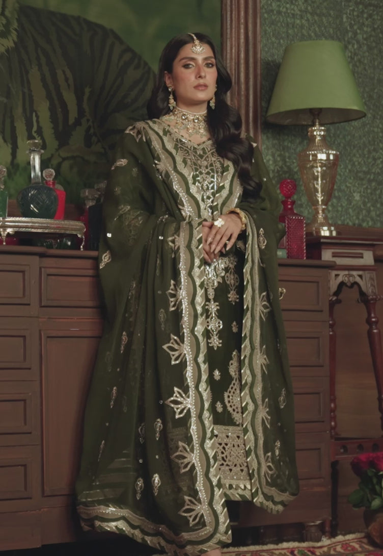 Radiate pearl brilliance in this peridot green attire featuring a long velvet shirt adorned with heavy beige embroidery threadwork. The embroidered neckline, front, and borders with pearls, creating an ethereal radiance. The embroidered daaman on beige velvet, with cutwork and pearls contributes to the ensemble's richness. The embroidered dupatta with its scallop four-sided borders completes this radiant peridot outfit, making it a radiating beauty.