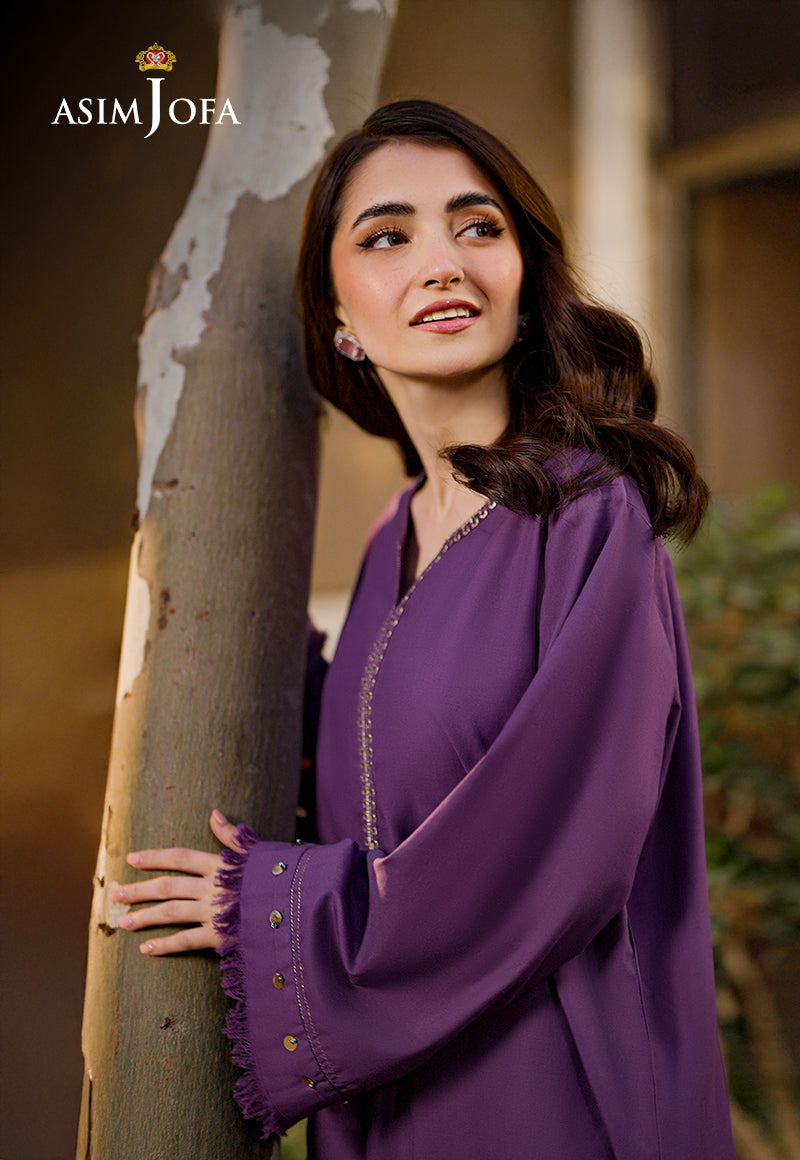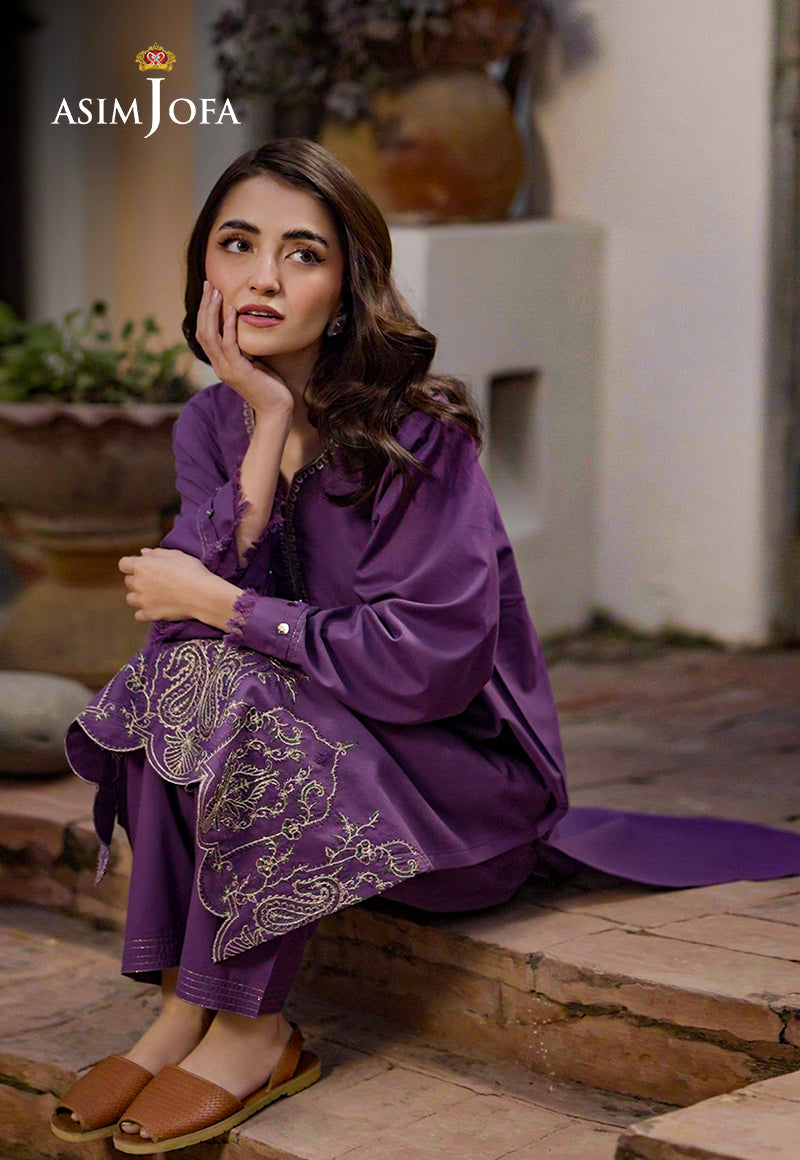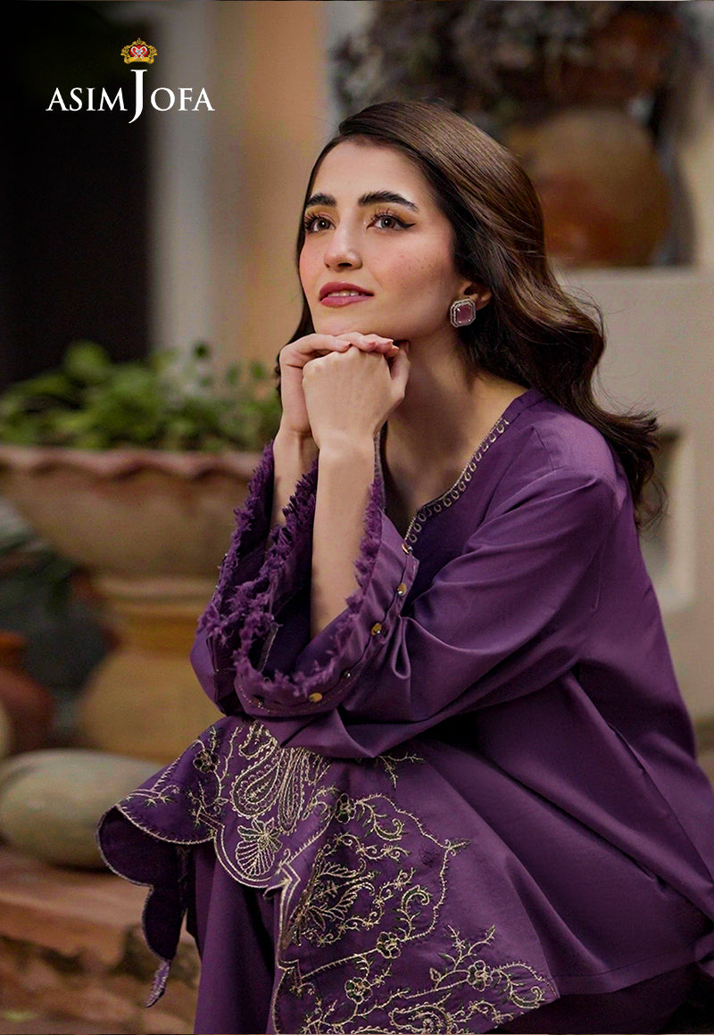 Turn heads with this exquisite purple outfit. The shirt features an intricately embroidered neckline and border, complemented by gorgeous detailing on the sleeves. Paired with stylish trousers, this ensemble is the perfect choice for an elegant look.