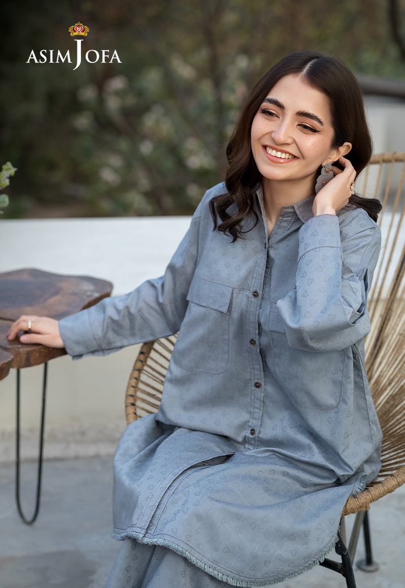 Effortlessly chic, this gray ensemble redefines class. The jacquard shirt is adorned with subtle heart motifs, featuring a classic collar and pockets on each side for a modern touch. Button detailing spans gracefully down the front, adding a polished finish. Paired with plain trousers, this outfit strikes the perfect balance between style and comfort.
