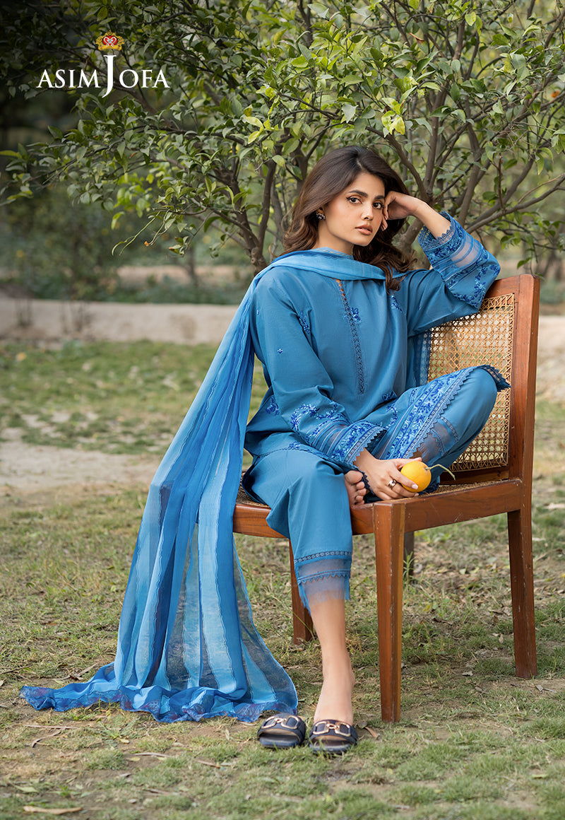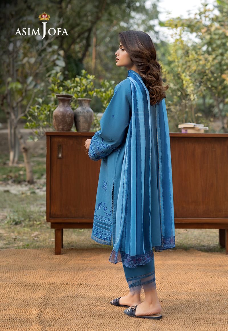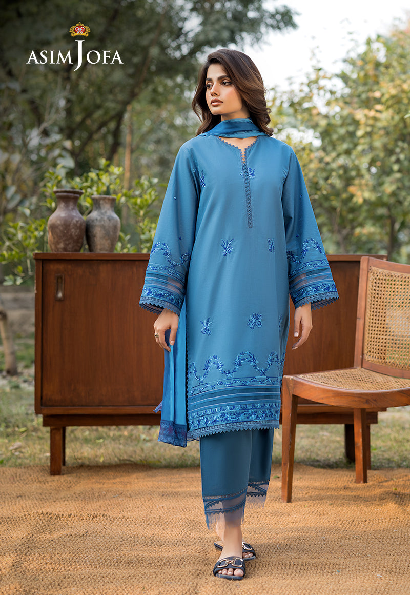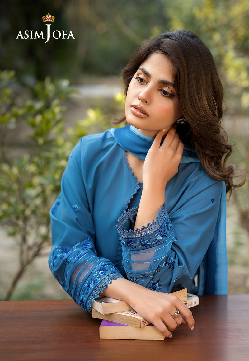 Draped in an air of sophistication, this stunning blue ensemble is a vision of grace. The shirt captivates with intricate embroidered motifs, exuding an aura of refined elegance. Delicate embroidery along the sleeves and hem adds depth and charm to the design. Complementing the ensemble is a gorgeous silk dupatta, lending a soft sheen. The stylish trousers offer a sleek contrast, ensuring a poised and polished look.