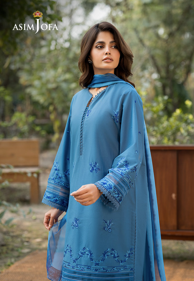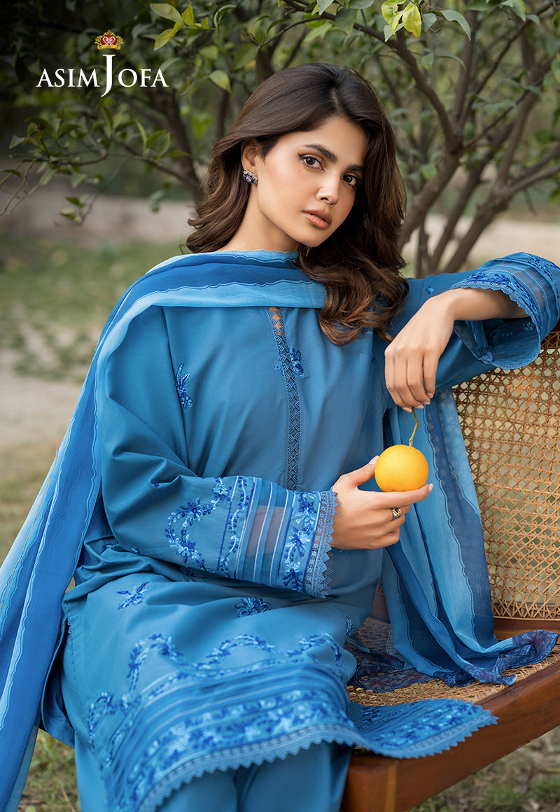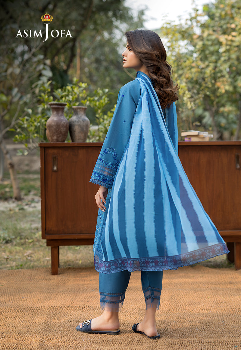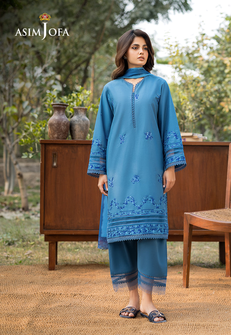 Draped in an air of sophistication, this stunning blue ensemble is a vision of grace. The shirt captivates with intricate embroidered motifs, exuding an aura of refined elegance. Delicate embroidery along the sleeves and hem adds depth and charm to the design. Complementing the ensemble is a gorgeous silk dupatta, lending a soft sheen. The stylish trousers offer a sleek contrast, ensuring a poised and polished look.