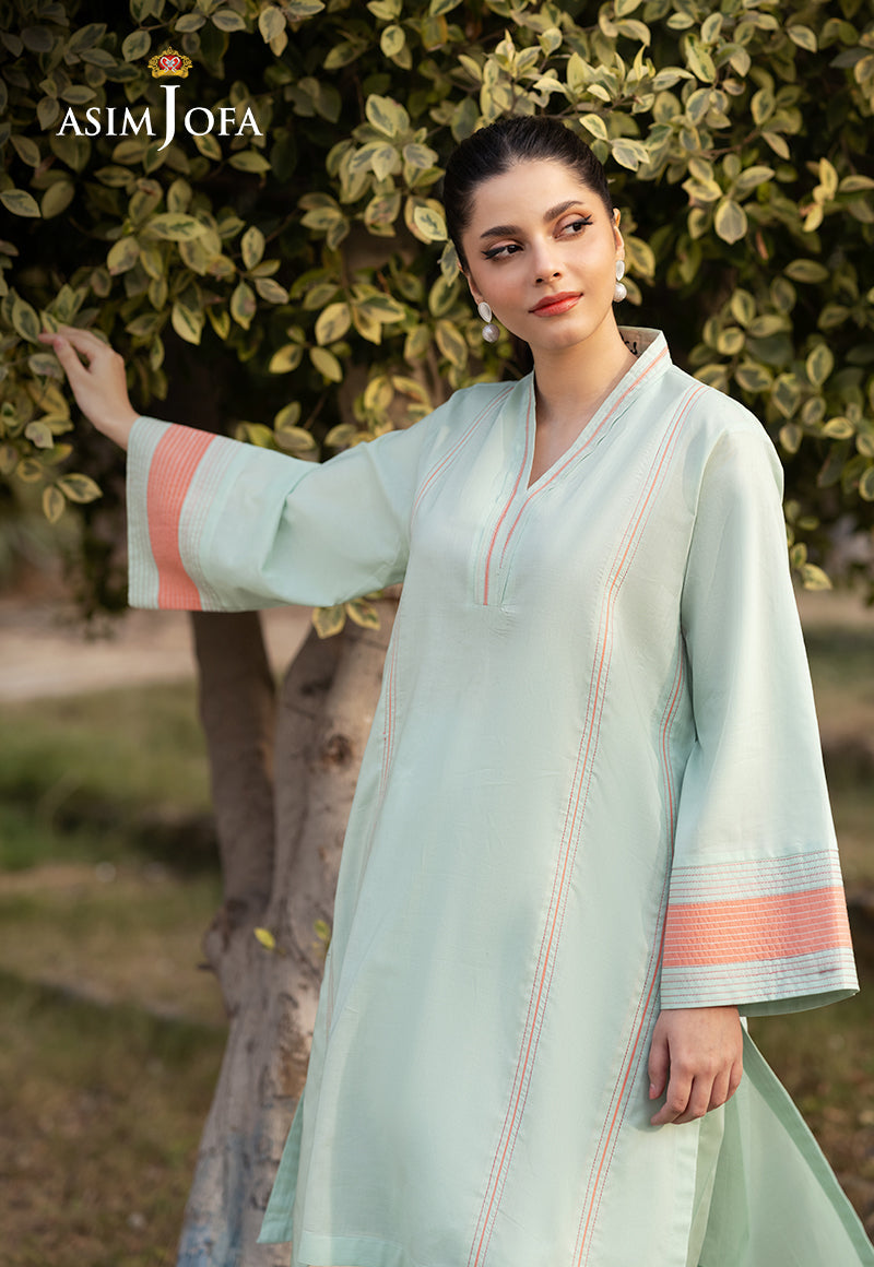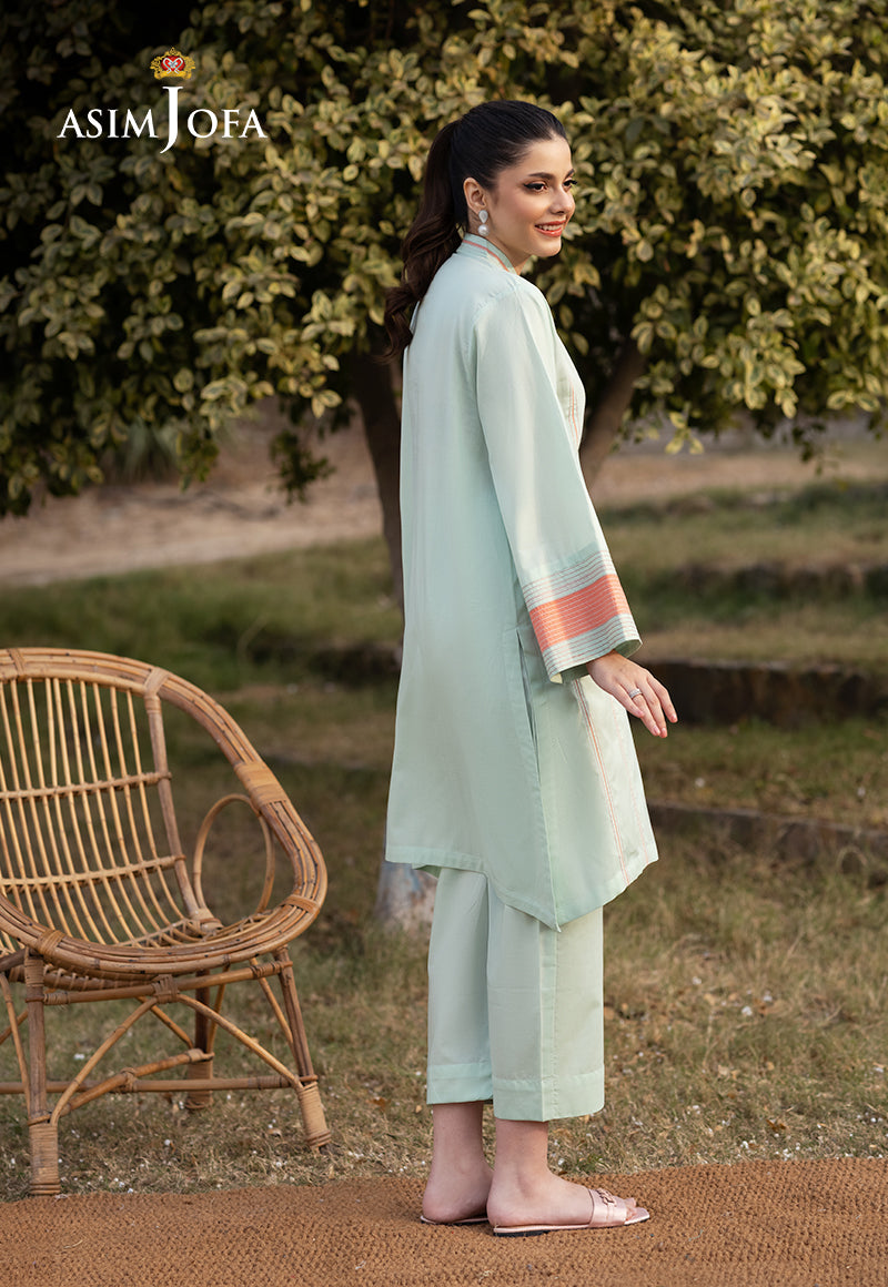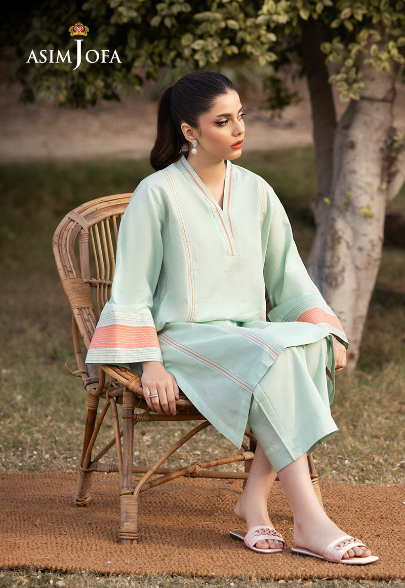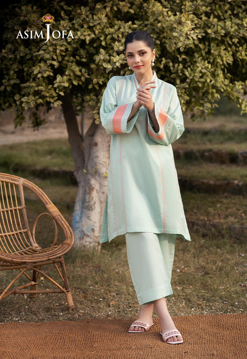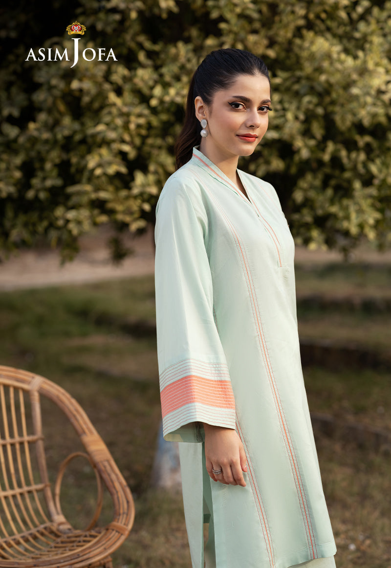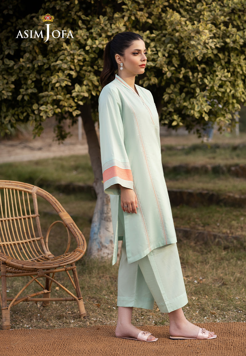 Exude effortless charm with this sea green outfit. The solid-colored shirt is enhanced with subtle stitching details and a striking color contrast at the sleeves, adding a modern touch to its design. Paired with plain trousers, this ensemble is a perfect blend of simplicity and contemporary style.