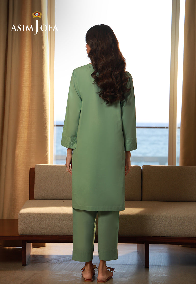 A breath of spring, this green ensemble whispers of understated elegance. The shirt, a canvas of serene simplicity, is punctuated by delicate floral motifs, their embroidered artistry scattered like blossoms across the fabric. The plain trousers provide a grounding balance, ensuring the subtle beauty of the embroidery remains the focal point.